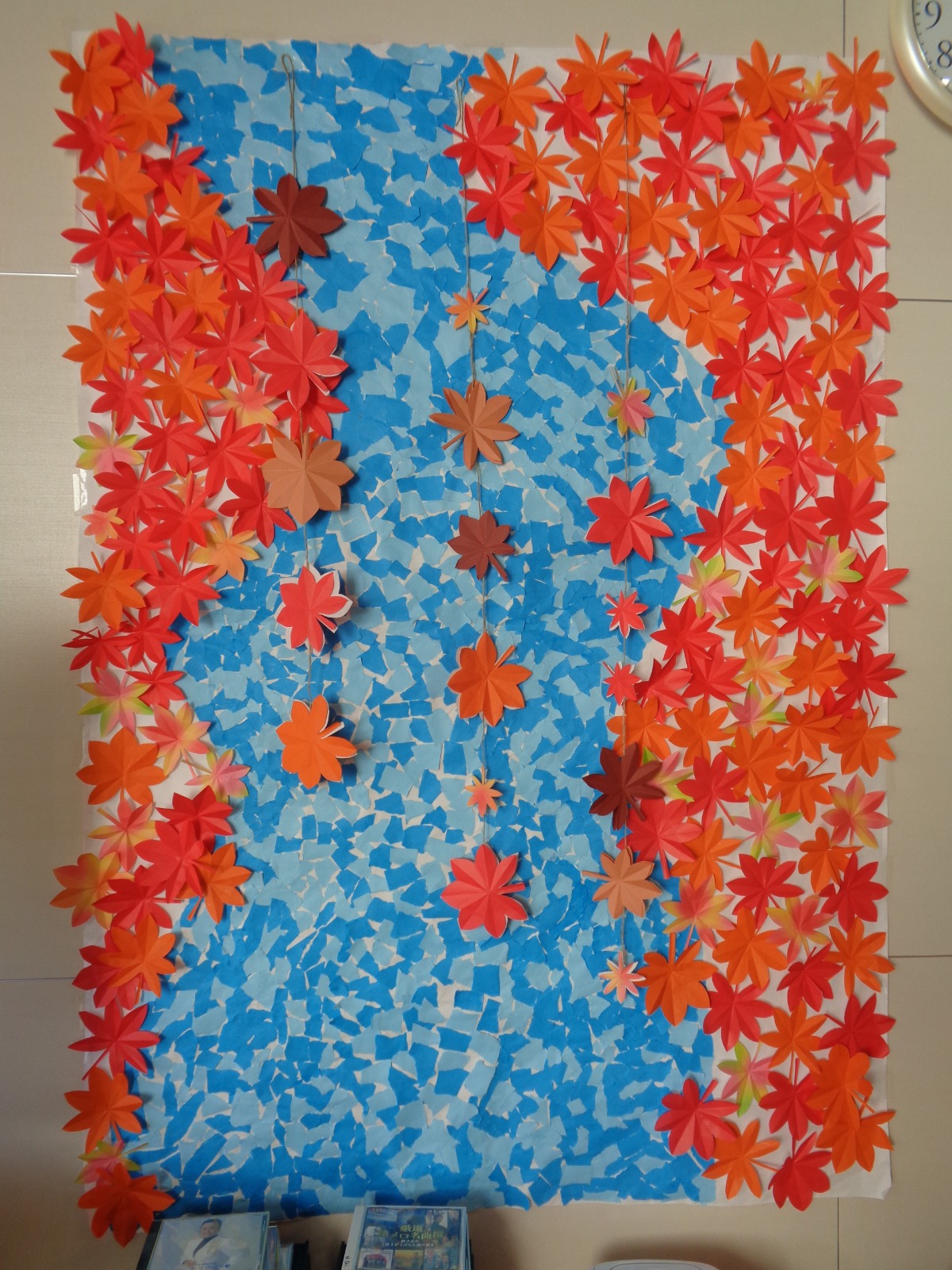 こちらは11月に紅葉が流れる川を貼り絵で作りました。「こう貼ったらいいのではないか」と会話を楽しみながら、取り組むことが出来ました。患者さんたちと一緒に作った力作ですので、こちらもデイルームに飾っています。